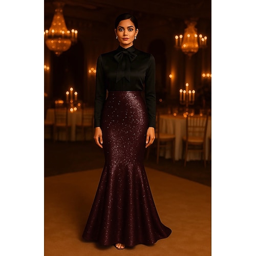 Sirena Tromba Lunghezza al pavimento Abito da Sera Elegante Scintillante Stile Celebrità Manica Lunga Collo Alto Festa in giardino Matrimonio Con Paillettes con Glitter
