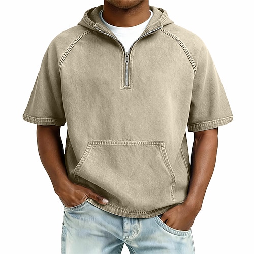 Da uomo Camicia di Jeans Maglietta di cotone Maglietta Manica Corta Con Cappuccio Estate Primavera Tutte le stagioni Tinta unica Retrò Vintage Angosciato Con zip All'aperto Streetwear Casual Blu
