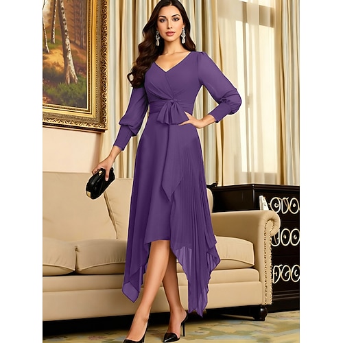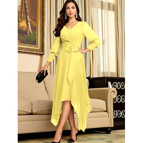 Linea ad A Asimmetrico Lunghezza Tè Vestito da Festa Abito da Cocktail Abito da invitata a nozze Abito da cerimonia per signora Manica Lunga Scollo a V Elegante Minimalista Formale Ospite di nozze