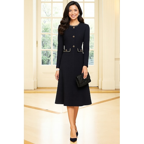 Linea ad A Lunghezza al ginocchio Abito in Raso Abito nero Vestito da Festa Abito da cerimonia per signora Manica Lunga Girocollo Scollo Tondo Elegante Vintage Abito Nero Formale Ospite di nozze