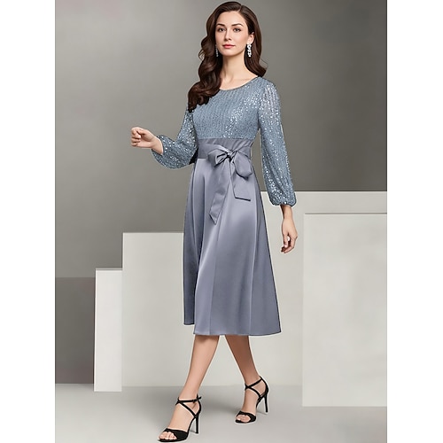 Linea ad A Lunghezza Tè Vestito da Festa Abito da Cocktail Abito da invitata a nozze Abito da cerimonia per signora Manica Lunga Girocollo Elegante Formale Serata Formale Ricevimento di matrimonio