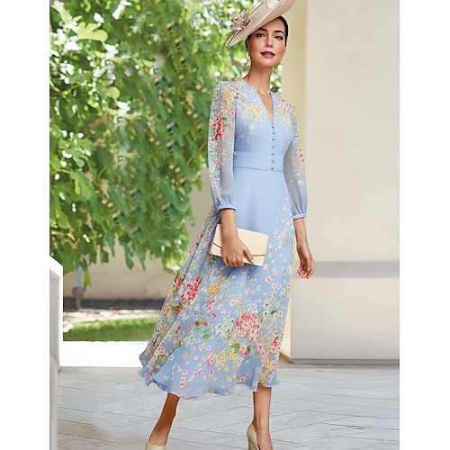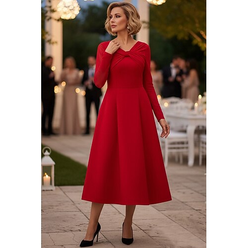 Linea ad A Abito Lunghezza Tè Vestito da Festa Abito da Cocktail Abito da invitata a nozze Abito da cerimonia per signora Manica Lunga Scollo a V Elegante Vintage Semplice Formale Ospite di nozze