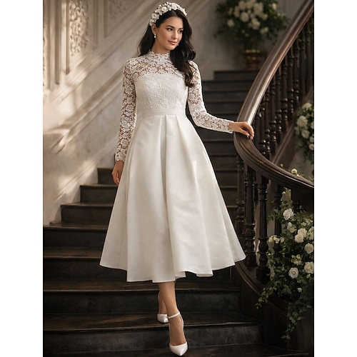 Linea ad A Lunghezza Tè Vestito da Festa Abito da Cocktail Abito da invitata a nozze Abito da cerimonia per signora Manica Lunga Collo Alto Sexy Ospite di nozze Abbigliamento da Festa Autunno Tessuto