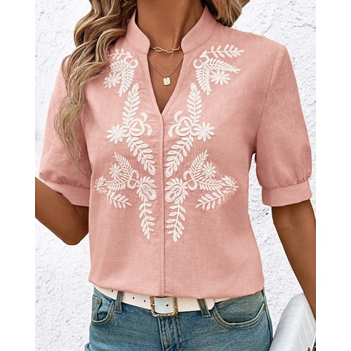Per donna Camicia Blusa Floreale Elegante Etnico Moderno Manica Corta Scollo a V Top Regolari Quotidiano Ferie Uscire Ricamato Blu Nero Rosa Verde Albicocca Estate Primavera
