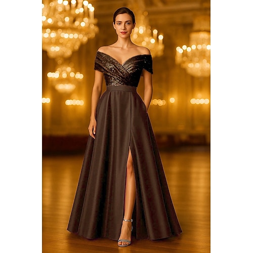Linea ad A Lunghezza al pavimento Lunghezza Tè Abiti da Cocktail Abiti da festa Elegante Scintillante Manica Corta Senza Spalle Matrimonio Formale Tasca Con Paillettes con Glitter