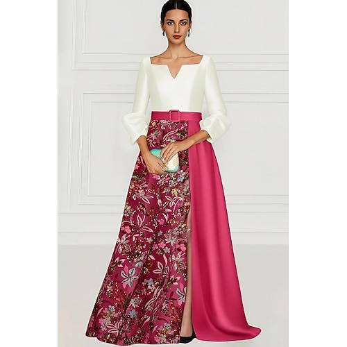 Linea ad A Lunghezza al pavimento Abito da Sera Da principessa Abito formale Elegante Spacco Alto Setoso Manica Lunga Scollo a V Matrimonio Formale Tasca Raso Jacquard con Tasca