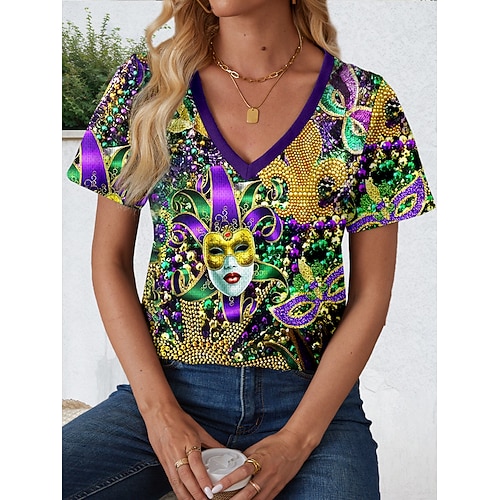 Carnevale Per donna Maglietta Grafico Elegante Casual Manica Corta Scollo a V Top Regolari Quotidiano Stampato Viola Estate