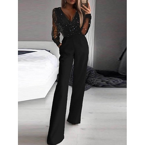 Per donna Normale Tuta Elegante Tinta unica Manica Lunga Scollo a V Patchwork Rete Club Streetwear Vestibilità regolare Nero Estate