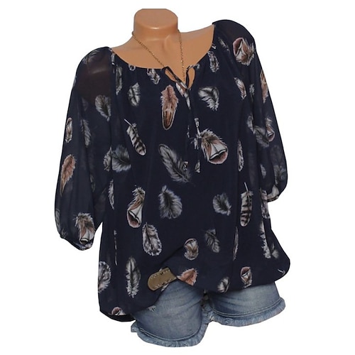 camicetta bohémien da donna con stampa di piume, manica lunga, scollo a V, lacci, top svolazzante, bianco marrone, casual, da spiaggia, da festival, vestibilità comoda, abbigliamento primaverile ed