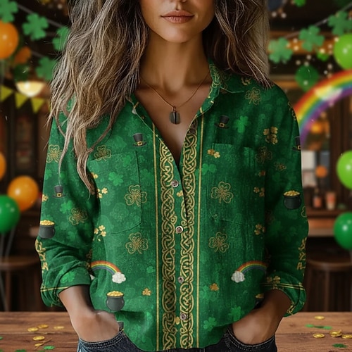 Festa di San Patrizio Per donna Camicia Camicia Boho Trifoglio Vintage Elegante Etnico Manica Lunga Colletto a Camicia Top Regolari Quotidiano Ferie Uscire Bottoni Stampato Verde primavera Verde