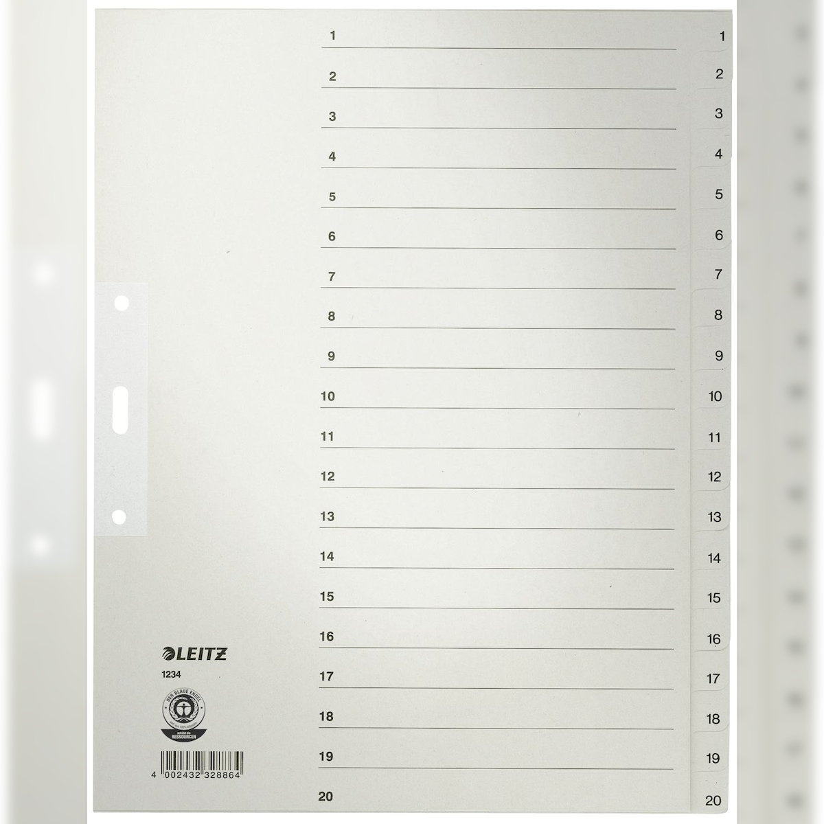 Leitz 1234-00-85 1234 Zahlenregister - 1-20, Papier, A4 Überbreite, 20 Blatt, grau