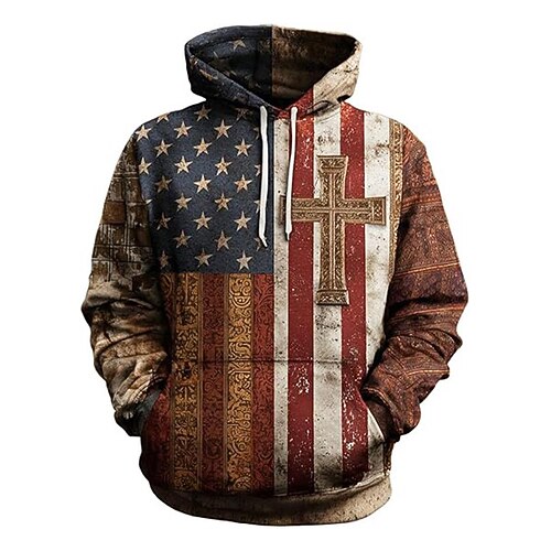 Per uomo Croce Bandiera Americana Felpa con Cappuccio Moda Casual Vintage Retrò Manica Lunga Con Cappuccio Vacanza Feste Abbigliamento casual alla moda Festival Blu Marrone Stampa Autunno Inverno