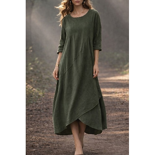 Abito Midi in Lino Falso per Donna Abito Shift Casual Giornaliero Vestibilità Ampia Colore Solido Maniche 3/4 Collo Rotondo Nero Verde Grigio Estate Autunno