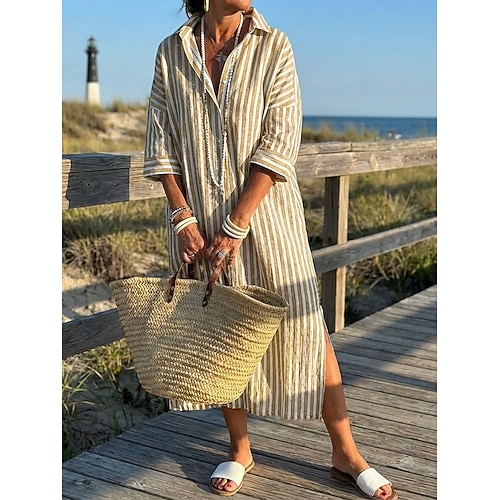 Per donna Abito Midi Misto cotone Abito Camicia Vestito a caftano Essenziale Casual Quotidiano Vacanza Vestibilità regolare Semplice Manica 3/4 Collo a V Nero Rosso Viola Azzurro Estate