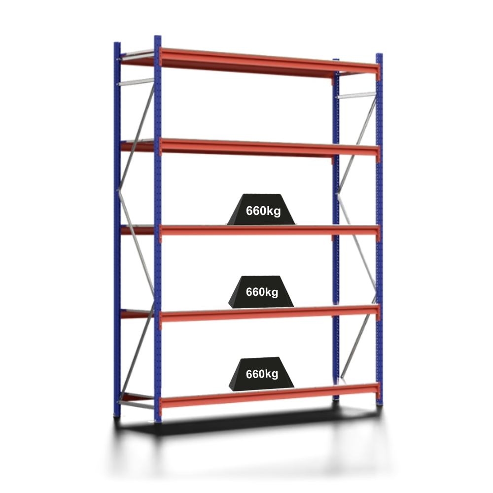 PROREGAL Weitspannregal MOOSE Stecksystem Omega-Profil, Grundregal, HxBxT 300x222x60cm, 5 Ebenen, Stahlplatten-Fachboden, Fachlast 660kg, Blau/Orange