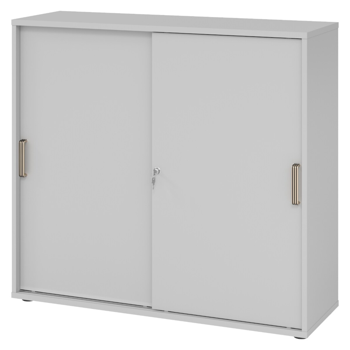 bümö Schiebetürenschrank 3OH - Aktenschrank abschließbar, Sideboard Schrank mit Schiebetüren in grau, Streifengriff - Büroschrank aus Holz mit