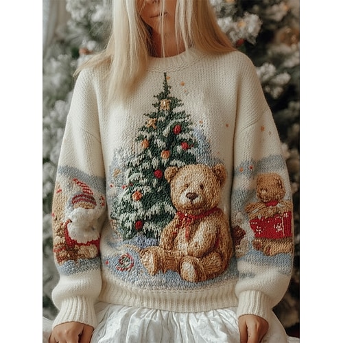 Per donna Felpa Maglione Carino Quotidiano Casual Grafico Animale Albero di Natale A Coste Girocollo Lavorato a maglia Stampato Manica Lunga Top Regolari Maglia Natale All'aperto Weekend Cachi
