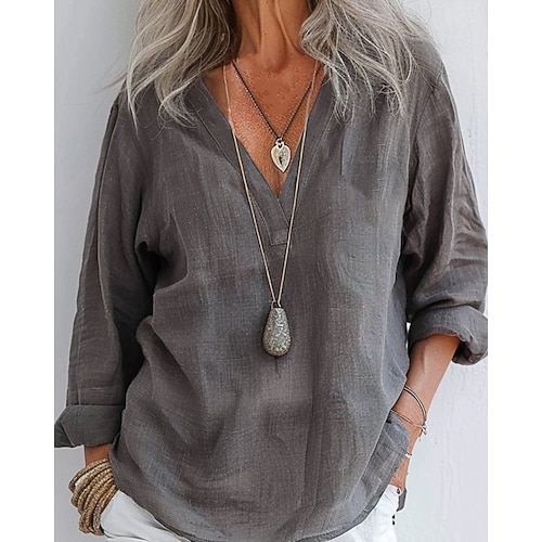 Per donna Camicie di cotone e lino Tinta unica Quotidiano Moderno Manica Lunga Scollo a V Top Regolari Quotidiano Ferie Nero Bianco Oro Albicocca Estate