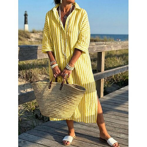 Per donna Abito Midi Abiti in cotone e lino Abito Camicia Elegante Moda Moderno Quotidiano All'aperto Vacanza Vestibilità comoda Semplice Manica 3/4 Girocollo Blu Verde acqua Giallo Verde chiaro