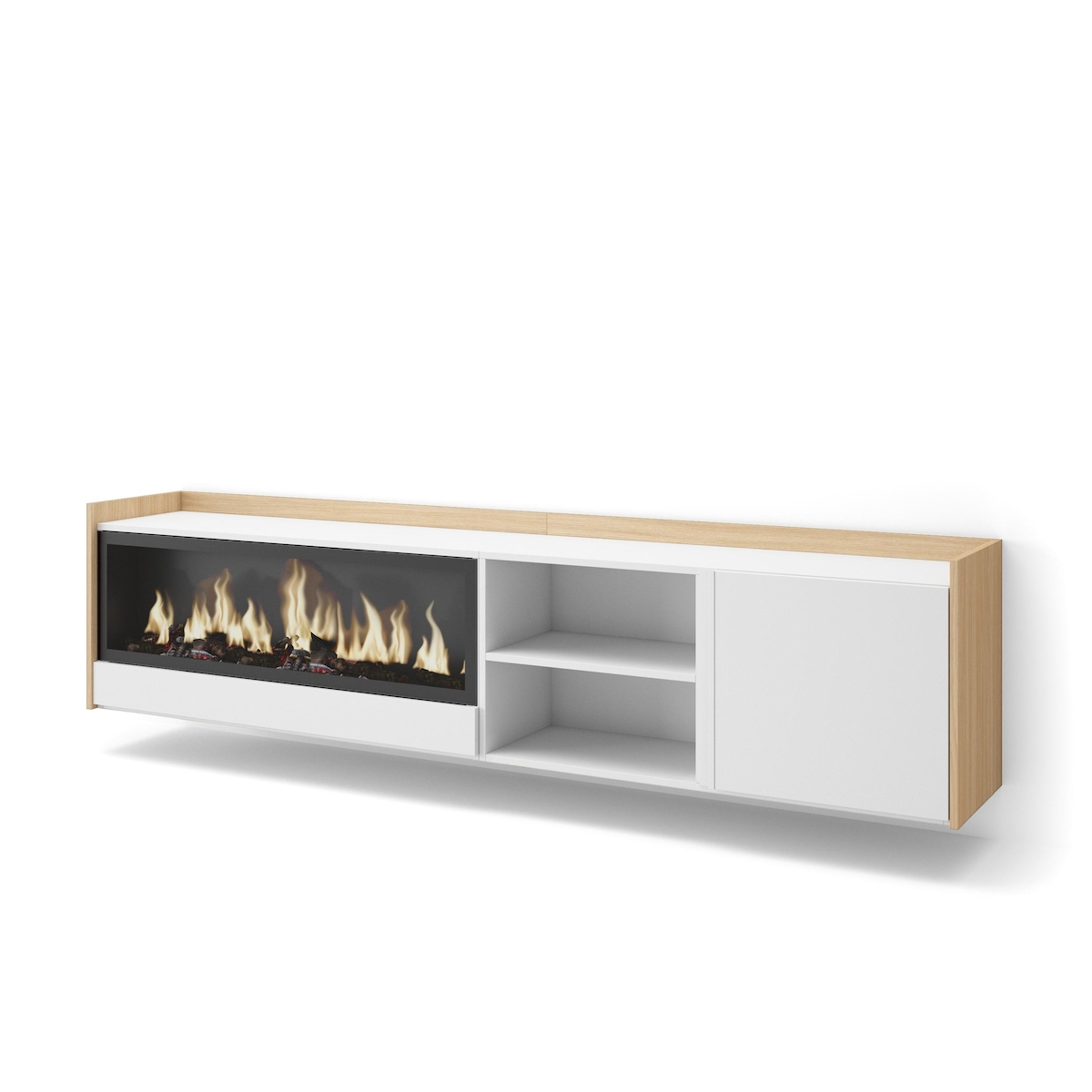 TV-Schrank, Lowboard, 212x50x35 cm, Für TV-Geräte bis zu 80", Elektrokamin XXL, Hängend, Weiß und Eiche Soft