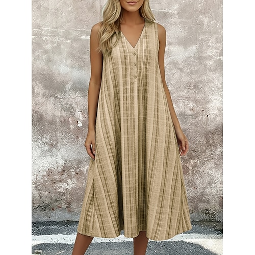 Per donna Abito Midi Abito in cotone e lino Moderno Quotidiano Vacanza Uscire Vestibilità comoda A righe Senza Maniche Scollo a V Blu Nero Rosa Viola Estate Primavera