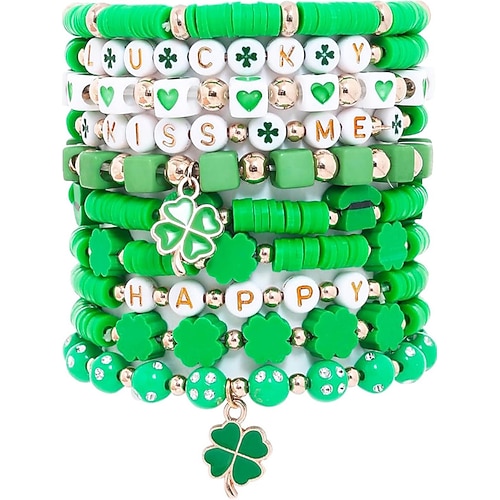 set di braccialetti da donna per il giorno di San Patrizio: braccialetti portafortuna con perline verdi e bianche e ciondoli a forma di trifoglio, perfetti da indossare durante festival e celebrazioni