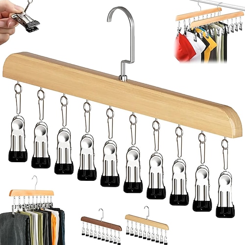 organizer per armadio con 10 clip - organizer per armadio sospeso salvaspazio, clip metalliche rotanti a 360° con rivestimento in silicone, ganci appendiabiti multifunzionali in legno massello per