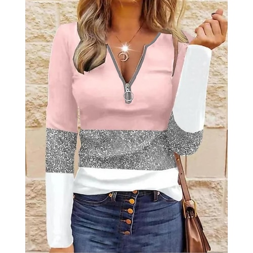 Per donna Maglietta Grafico Geometrico Blocco di colori Vintage Elegante Classico Manica Lunga Scollo a V Girocollo Top Regolari Quotidiano Weekend Cerniera Stampato Giallo Rosa Blu Viola Primavera
