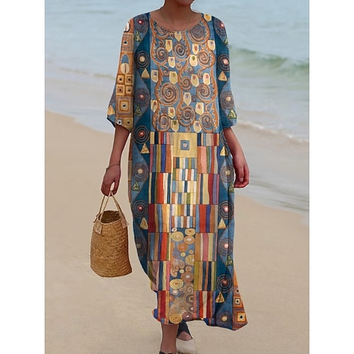 Abito Maxi Donna Kaftano Manica 3/4 Girocollo Abito Casual Abito A Line Boho Vestibilità Regolare Grafiche Geometriche Astratte Bianco Giallo Blu Arancione Primavera Autunno