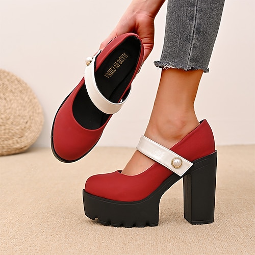 Per donna Quotidiano Tacco grosso Punta Tonda Moda Finta Pelle Cinturino alla Caviglia Arancione e nero Nero Rosso chiaro