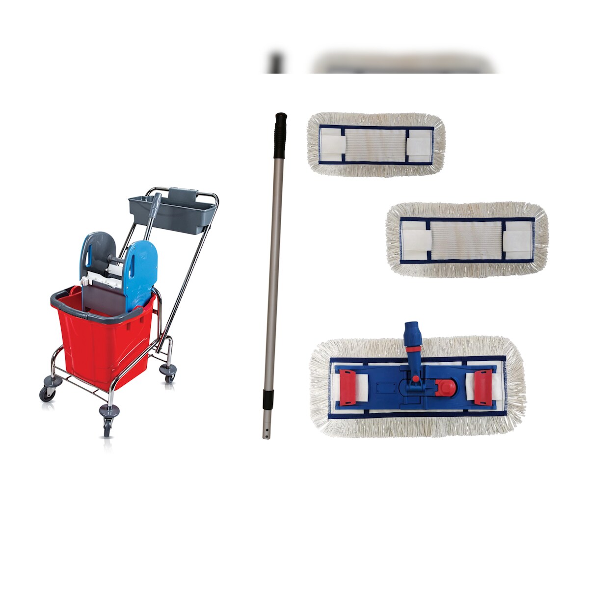CleanSV Wischset chrom Laschenmop 40 cm, Ablage, Reinigungswagen 1 x 18 Liter Eimer, Presse, Deichsel, Putzwagen, Bodenwischer