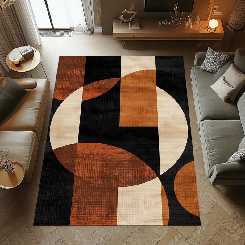 Abstract Circle Rug, Burnt Orange Beige Black Carpet, Modern Minimalist Washable Floor Mat
