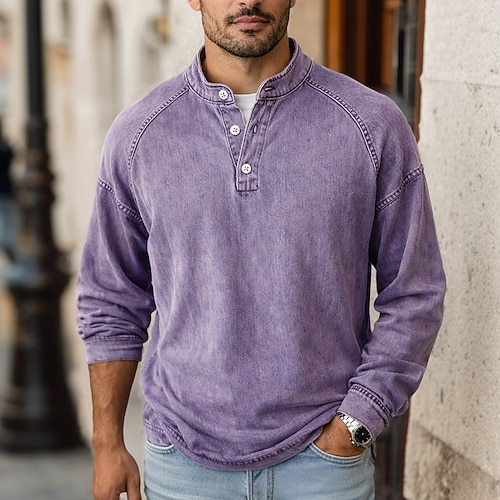 Da uomo Maglietta Maglia Henley Camicia 100% cotone lavaggio acido Manica Lunga Collo alla coreana Henley Primavera Autunno Autunno Inverno Semplice Vintage Streetwear Casual Lavato Manica corta