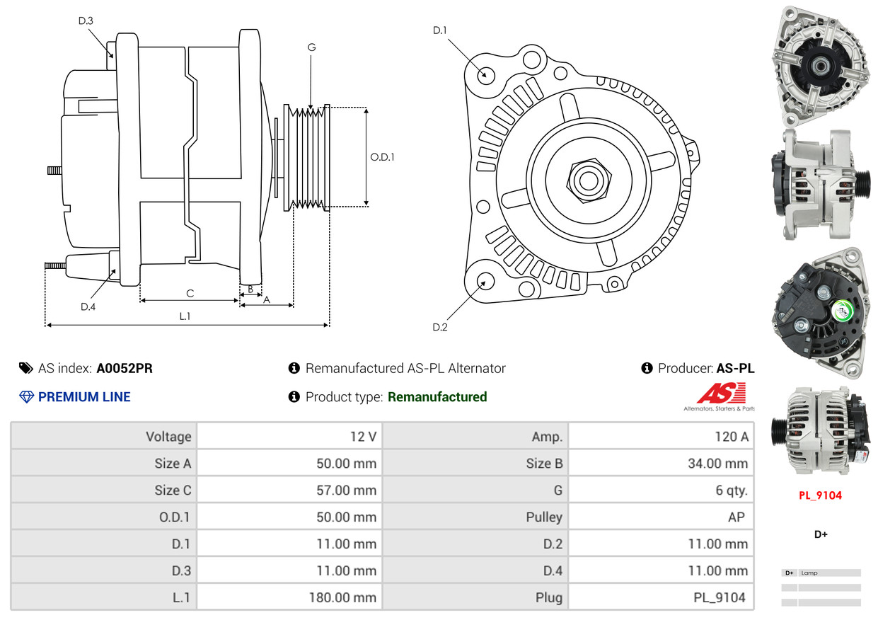 AS-PL Generator A0052PR 12V 120A für GENERAL MOTORS DAF OPEL 93175961 9512798 6204149