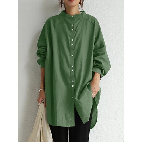 Per donna Camicie di cotone e lino Bottoni Tinta unica Quotidiano Elegante Essenziale Manica Lunga Collo Alto Top lunghi Quotidiano Blu Marrone Verde Beige Estate Primavera Autunno
