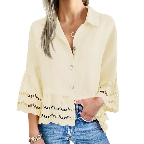 Per donna Camicia casual Camicia con Bottoni Blusa Pizzo Bottoni Tinta unica Semplice Vacanza Quotidiano Elegante Manica Lunga Collo ripiegato Top Regolari Ferie Abbigliamento mare Abbigliamento da