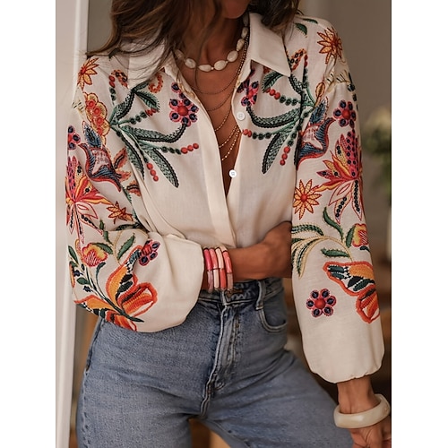 Per donna Blusa Floreale Elegante Casual Manica Lunga Colletto a Camicia Top Regolari Quotidiano Bottoni Stampato Bianco Primavera Autunno