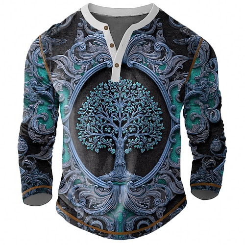 Per uomo Grafico Alberi Maglia Henley Maglietta Manica Lunga Vintage Elegante Casuale Quotidiano All'aperto Primavera Primavera Autunno Blu scuro Verde Cachi Henley Maglietta Henley
