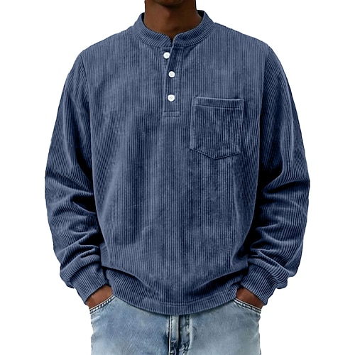 Per uomo Maglietta Camicia di Velluto a Coste Maglia Henley Manica Lunga Henley Primavera Autunno Tinta unica Vintage Streetwear Elegante Tasca Manica corta Quotidiano All'aperto Vacanza Nero Blu