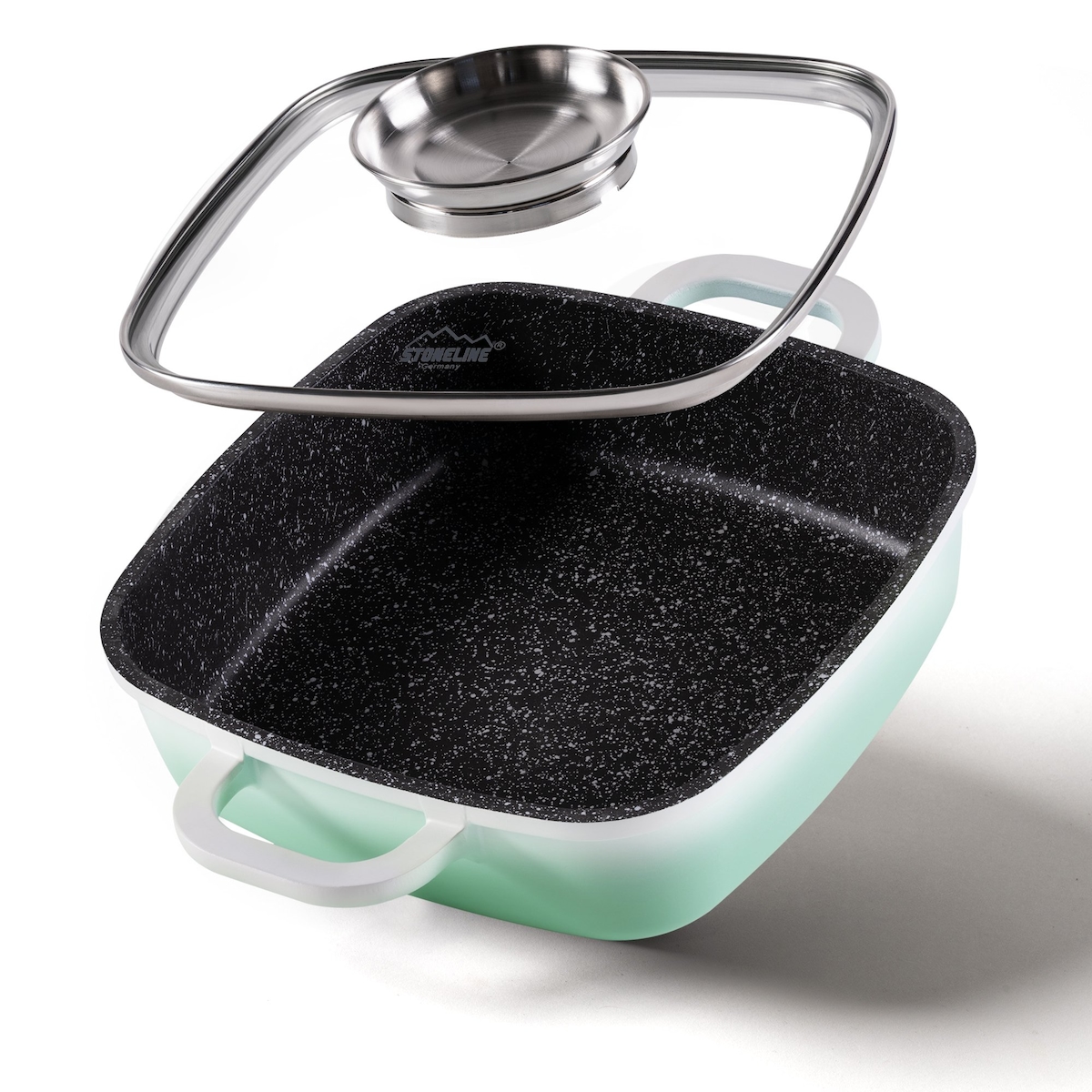 STONELINE® Mint Servierpfanne 20 x 20 cm mit Aroma Glasdeckel, Eckpfanne antihaftbeschichtet, Induktion
