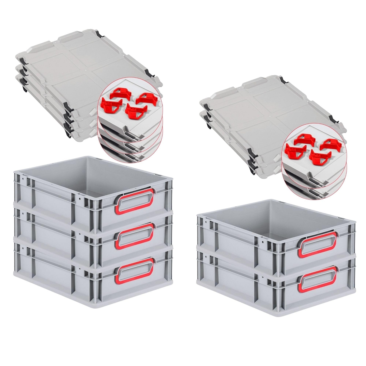 PROREGAL SparSet 5x Eurobox NextGen Color mit Auflagedeckel & Verschlüsse, HxBxT 12x30x40cm, 11L, Grau, Griffe rot zu, Eurobehälter, Box