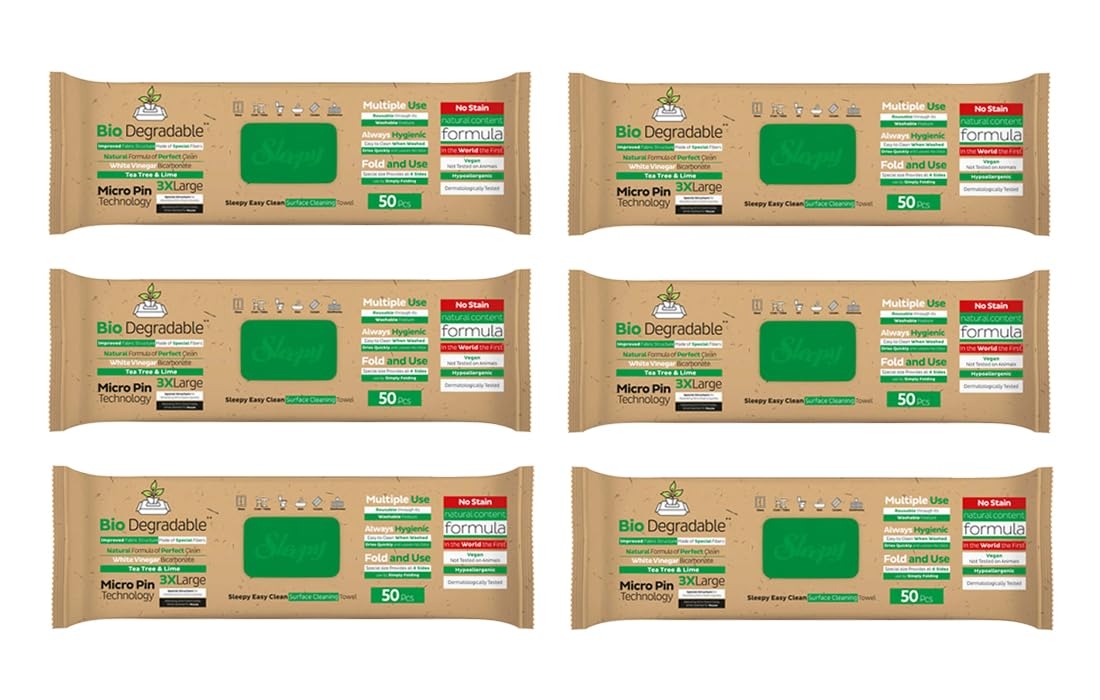 Sleepy Easy Clean Bio Oberflächen und Boden Reinigungstücher 2 in 1 (Grün) mit Teebaum & Limette - 6 Packung x 50 Tücher