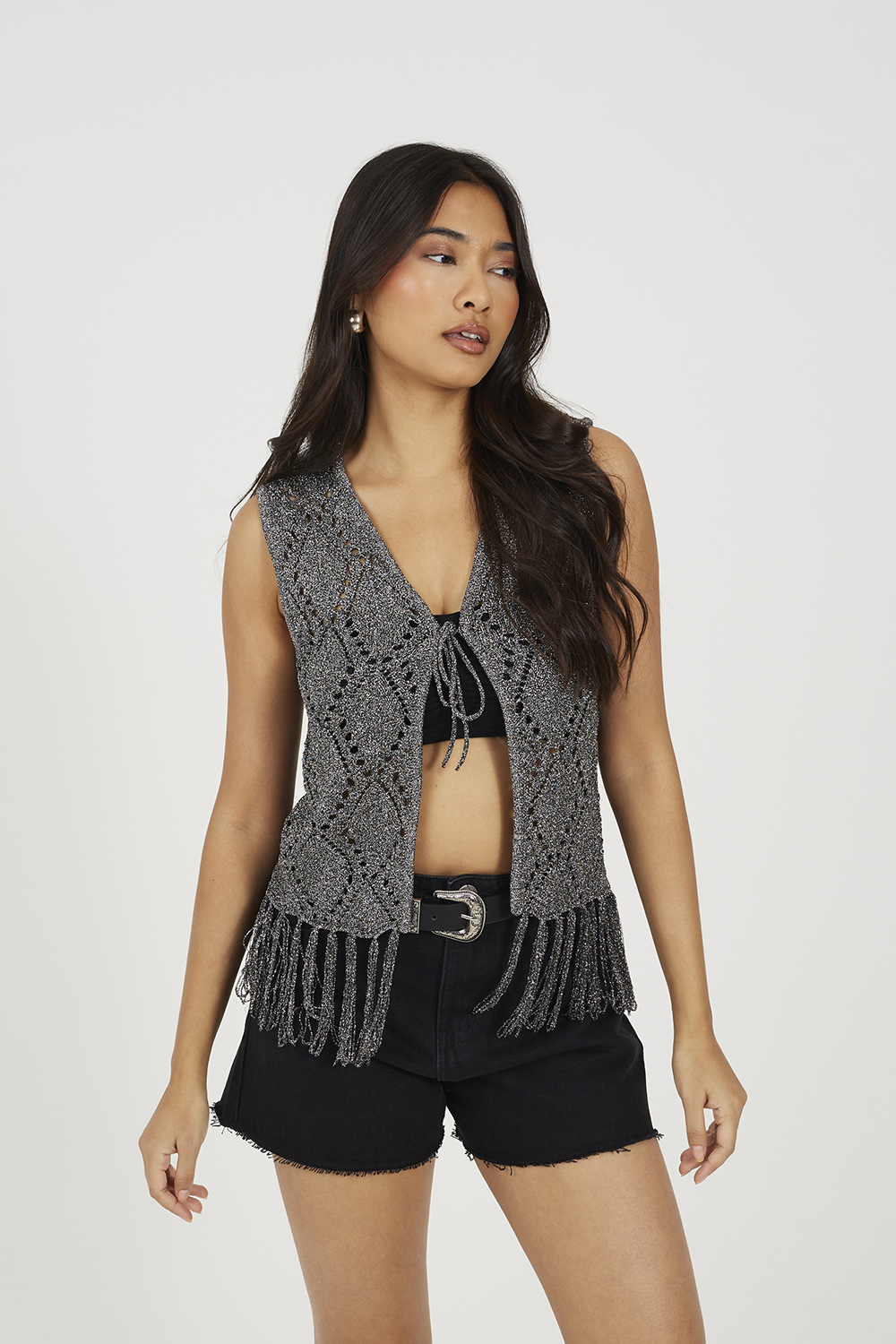 Brave Soul Womens Black Metallic Tie Front Waistcoat - Size X-small | Brave Soul Sale | Discount Designer Brands