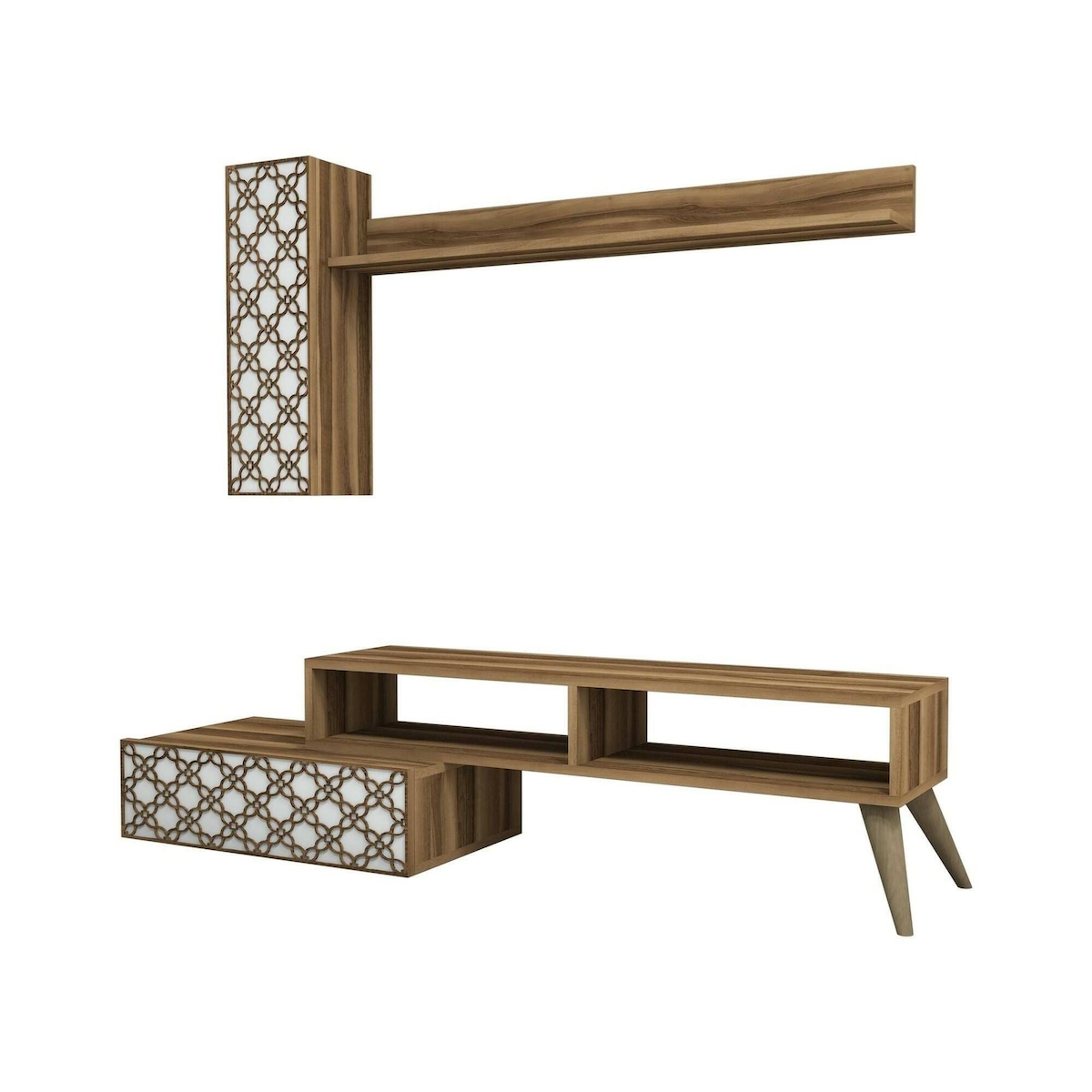 Dmora Wohnzimmermöbel Dpinard, Modulares Wohnzimmerset, Mehrzweck-Wohnzimmermöbel, Moderner TV-Schrank, 150x37h38 cm, Walnuss und Weiß