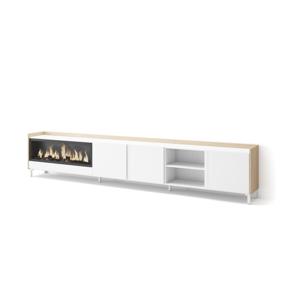 TV-Schrank, Lowboard, 315x61x35 cm, Für TV-Geräte bis zu 80", Elektrokamin XXL, Industriedesign, Weiß und Eiche Soft