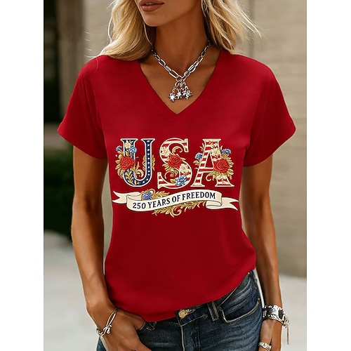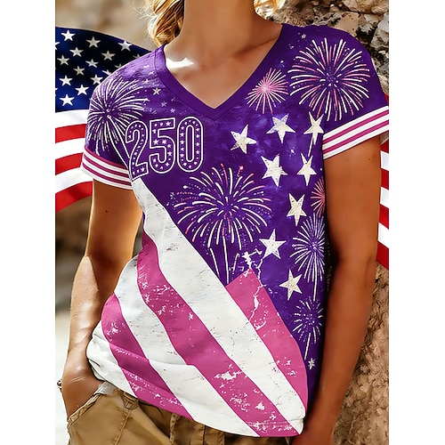 Maglietta patriottica per il Giorno dell'Indipendenza Donna 250° Anniversario Americano Maglietta Grafica Bandiera Vintage Elegante Classico Manica Corta Collo a V Stampa Quotidiana Blu Nero Blu Navy