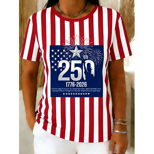 Giorno dell'Indipendenza Americana Per donna Maglietta Stampato Grafico Bandiera A righe Elegante Classico Casual Manica Corta Girocollo Top Regolari Quotidiano Uscire Weekend Rosso Estate Primavera