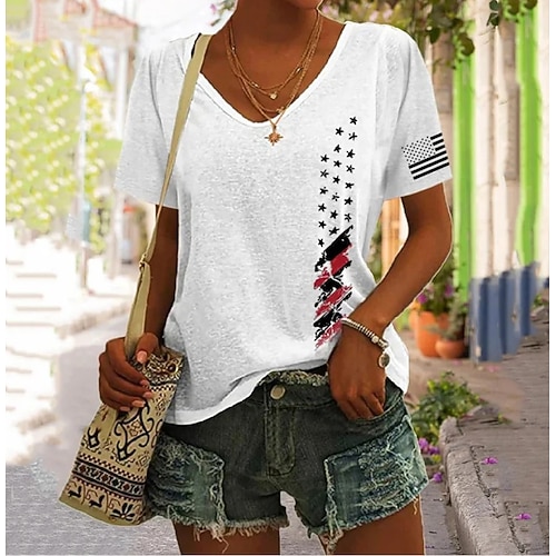 Giorno dell'Indipendenza Americana Per donna Maglietta Stampato Grafico Bandiera Vintage Elegante Classico Manica Corta Scollo a V Top Regolari Quotidiano Cenere Nero Bianco Estate Primavera