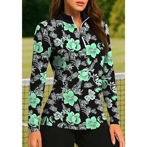 Per donna Piante Floreale Tropicale Motivo Floreale Top Polo da golf Maglia da tennis Manica Lunga Stampato Zip a un quarto Pullover Protezione UV Elastico Traspirante Tennis Golf Pickleball Collo