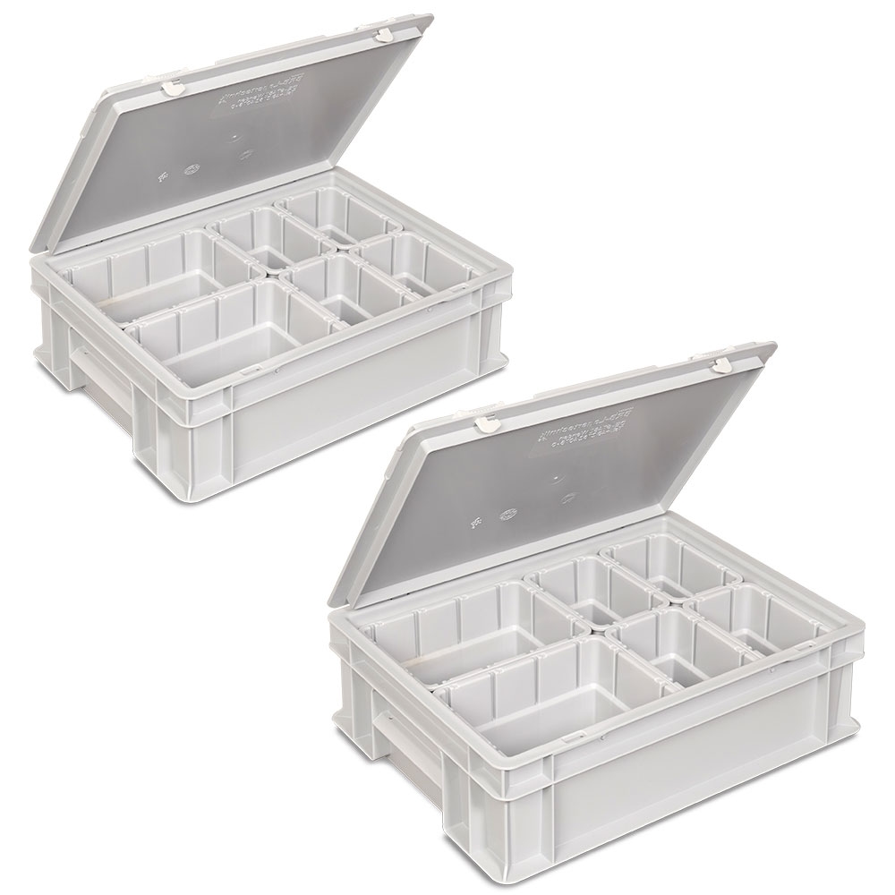 2x Euro-Deckelbehälter mit 6 Einsatzkästen, LxBxH 400x300x130 mm, grau